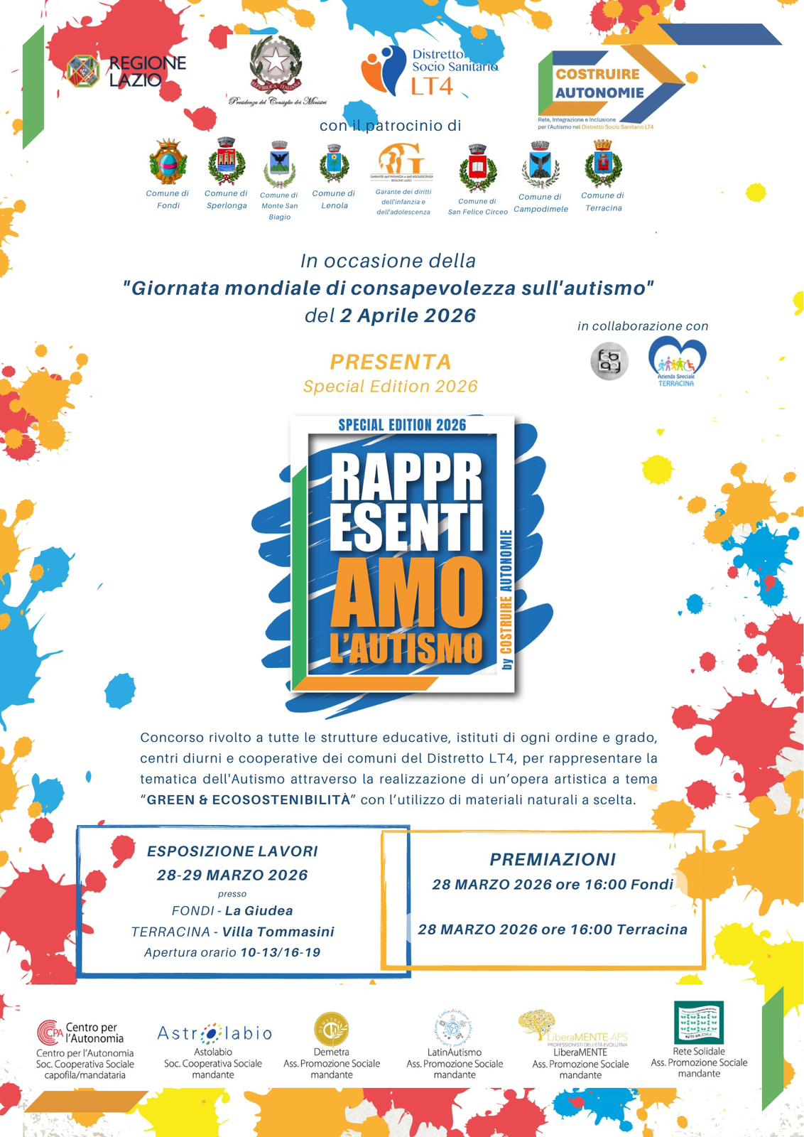 L’ATS “Costruire Autonomie” —: rete, integrazione e inclusione per l’Autismo, che vede la sinergia tra Centro per l’Autonomia s.c.s, Astrolabio s.c.s, Demetra a.p.s, LatinAutismo a.p.s, LiberaMente a.p.s e Rete Solidale a.p.s — in collaborazione con il Distretto Socio-Sanitario LT4, ha il piacere quest’anno di essere organizzatore di questa speciale iniziativa che prenderà il nome di “Special Edition 2026 RappresentiAMO l’Autismo by Costruire Autonomie”.